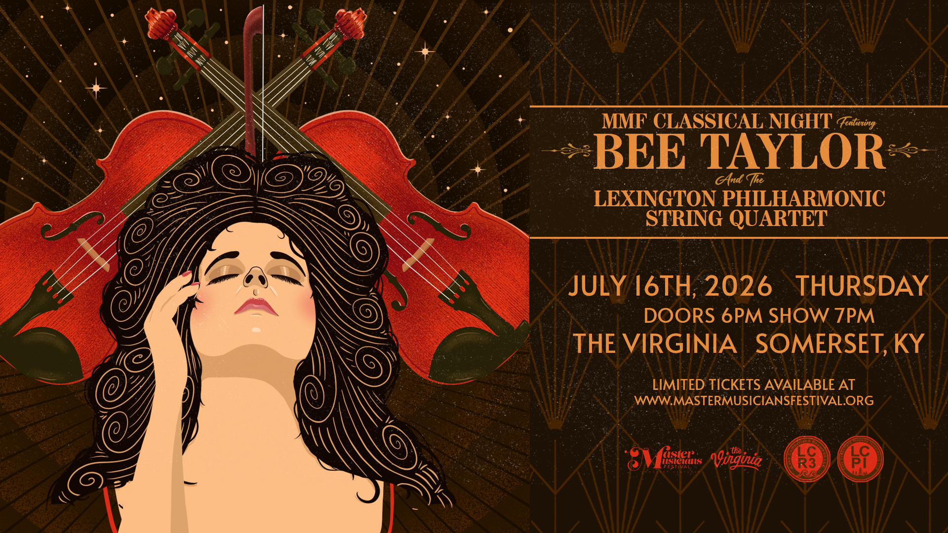 Bee Taylor returns to the stage with the Lexington Philharmonic String Quartet for a special Classical Night performance at the historic Virginia Theater as part of the 33rd Annual Master Musicians Festival.